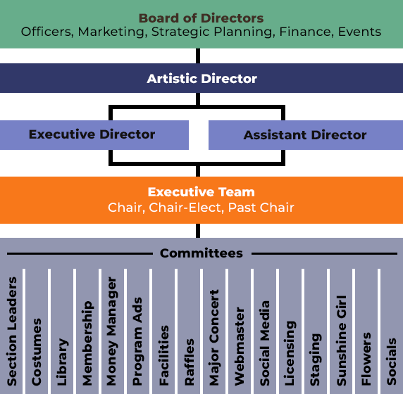 Three main areas of volunteer leadership — the board of directors, the executive team, and various committees — consist of over 30 committed individuals who each play a part in supporting our health and growth, while receiving inspiration from the professionalism, commitment, and musical acumen of the artistic director.
